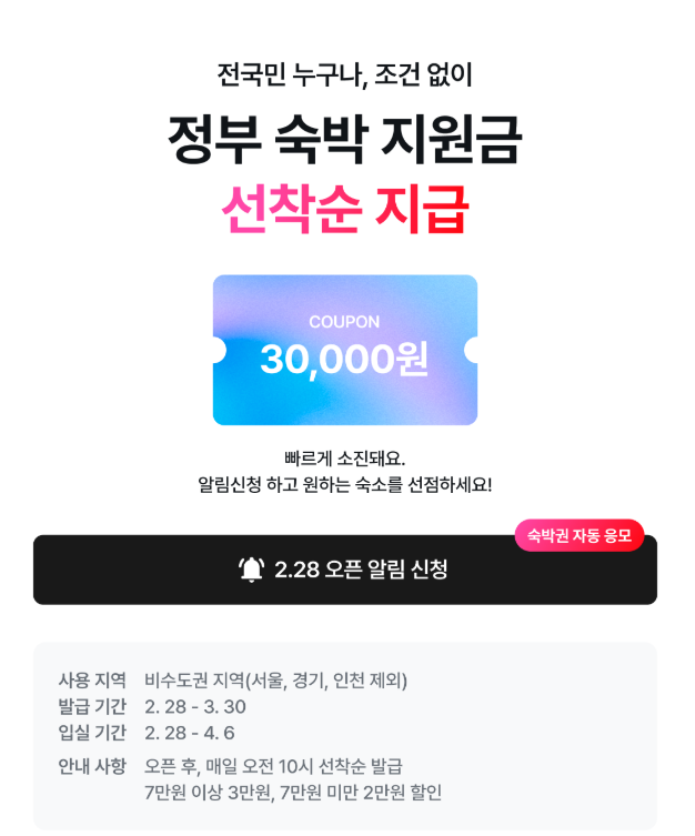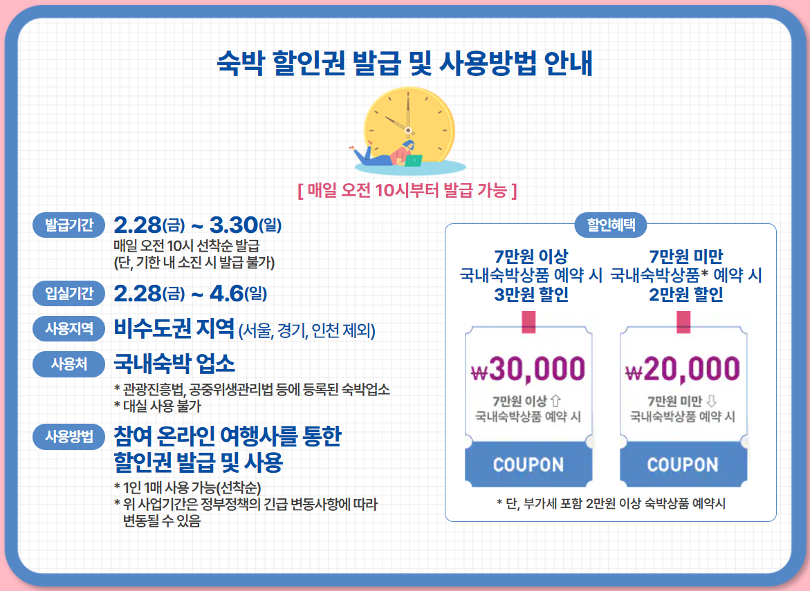 숙박 할인권을 이용하려면 2월 28일부터 매일 오전 10시에 지정된 온라인 여행사(OTA) 웹사이트에 접속해 할인권을 발급받아야 합니다. 1인당 1매씩 선착순으로 지급되며, 예약 과정에서 할인권을 적용해 결제하면 자동으로 할인 금액이 반영됩니다.