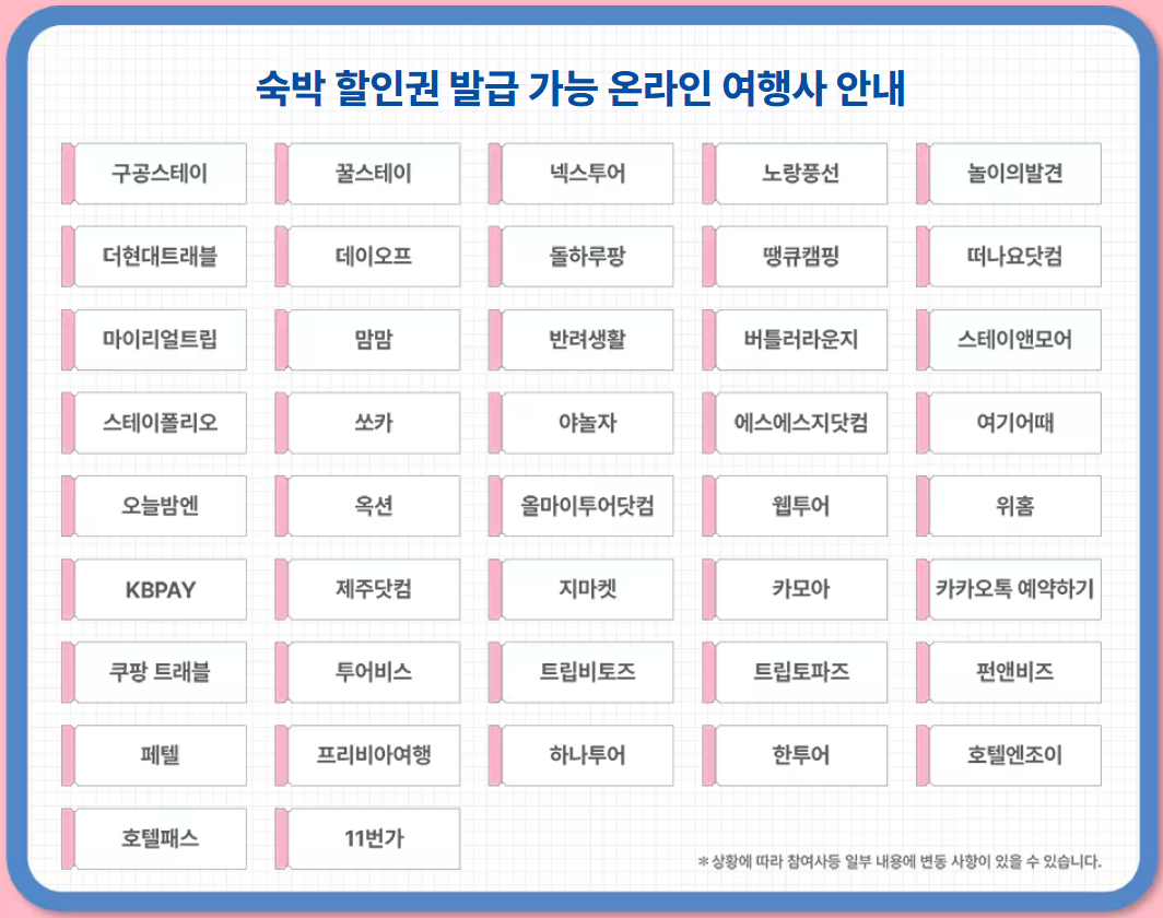 여기어때, 마이리얼트립, 야놀자 등 42개 업체에서 발급이 가능하며, 각 여행사별로 할인권 지급 방식과 적용 조건이 다를 수 있으므로 사전에 확인하는 것이 중요합니다.