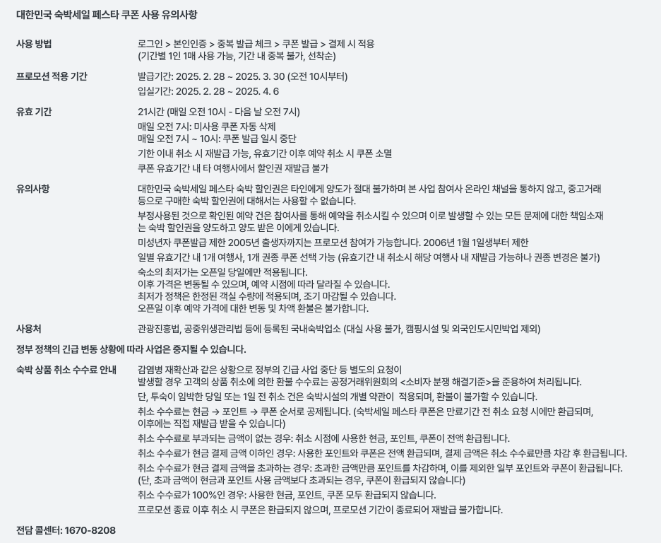 원하는 숙박시설을 미리 검색해보고, 할인권을 사용할 수 있는지 여부를 체크한 후 예약을 진행하는 것이 바람직합니다. 다른 문의사항은 전담 콜센터 1670-3980로 문의하시기 바랍니다.